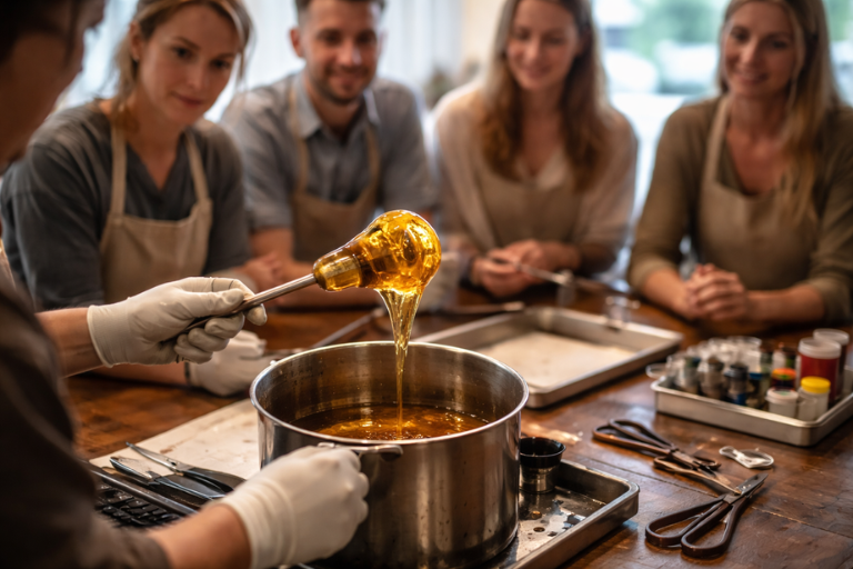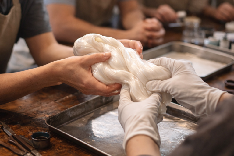 飴細工体験は、約90度に熱せられた水飴を使い、冷え固まる前の柔らかい状態のうちに素早く形を作るアクティビティです。火傷しないよう手袋を着用し、職人の指導のもとで安全に楽しんでいただけます。