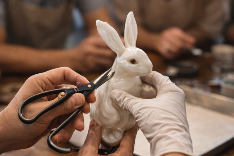 いよいよ形作りの工程です。専用の「握りバサミ(和バサミ)」を使い、飴をパチンと切ってウサギの耳を作ったり、伸ばして足を作ったりします。まるで魔法のように動物のシルエットが現れる様子に、思わず見入ってしまうことでしょう。