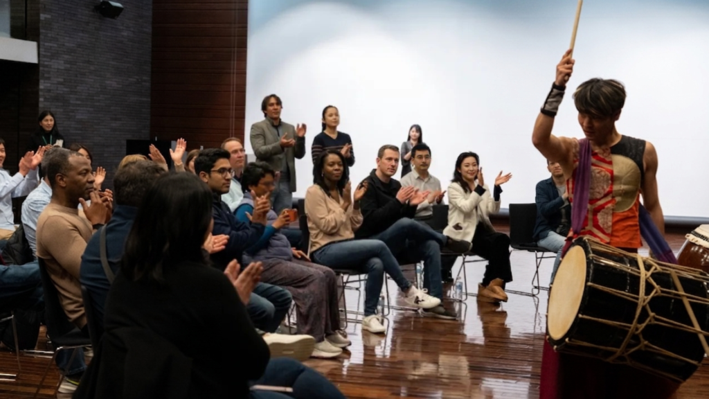初日は豊洲での和太鼓体験からスタートしました。講師の迫力ある演奏をご覧になっていたお客様たちは体を揺らしたり、立ち上がってプロの演奏者の演奏を楽しんでおりました。