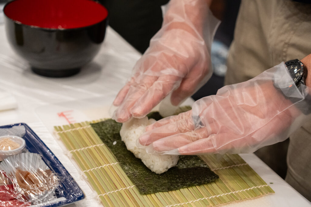 昼食の寿司作り体験では、握りや巻物に挑戦。
