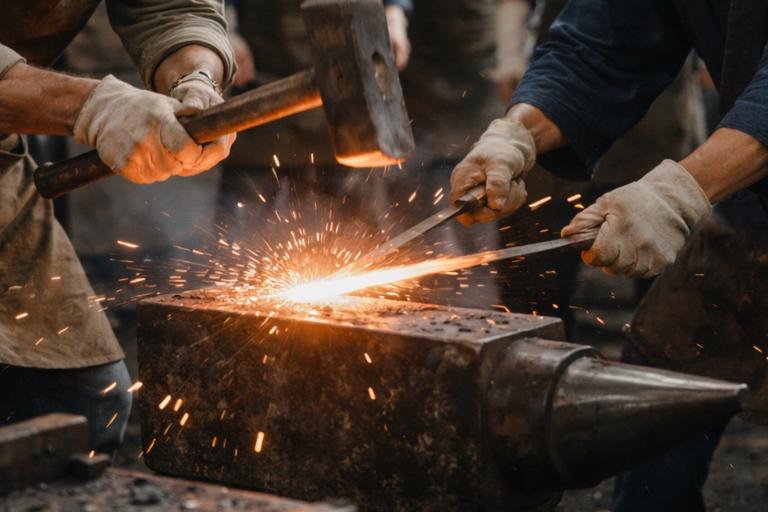 日本刀鍛冶体験は、熱い鉄を叩いて形を作る「鍛錬(たんれん)」を中心とした本格的なプログラムです。職人の手仕事を間近で学びながら、鉄が力強い道具へと姿を変えていく神秘的なプロセスを肌で感じていただきます。