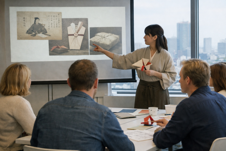 まずは折り紙の起源や歴史についての講義から始まります。かつては贈り物に添える儀礼的な飾り(折形)として発展してきた背景を知ることで、一枚の紙に向き合う姿勢が少し変わるかもしれません。