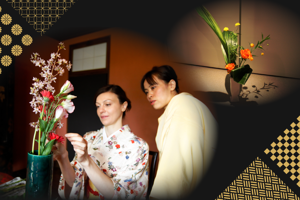 「華道」は四季折々の植物を用いて制作される日本の文化・芸術です。 そこには日本ならではのわびさびが表現され、海外のフラワーアレンジメントとは違った 和の空間を作り出します。また、実際に着物を着ていただき和の空間を感じていただきます。